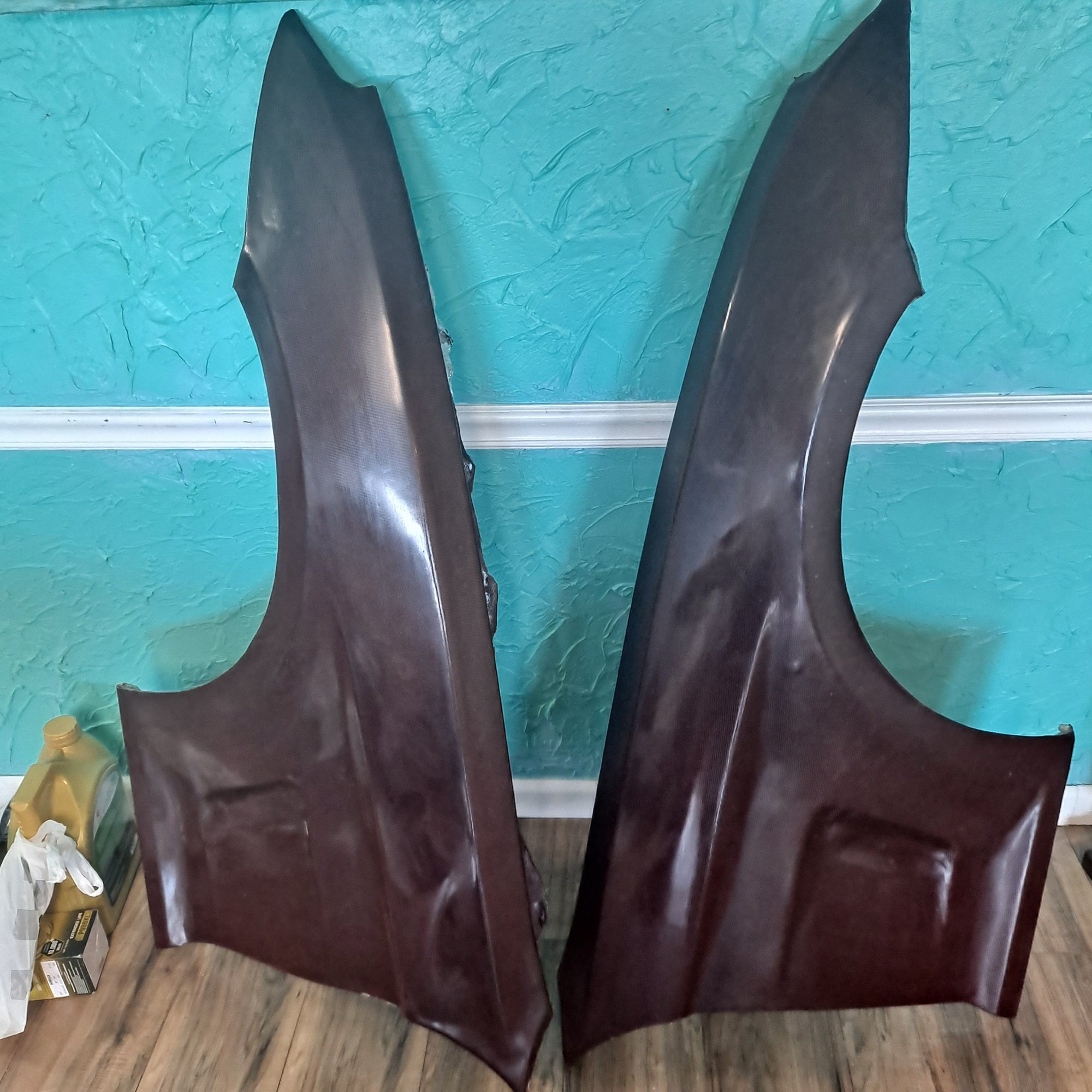The fenders are done. The original 9.8lbs for one side to 2.4lbs in carbon kevlar red. It would be 14 lbs loss, but I removed the washer reservoir and components while the right fender was off. Lost another 2.5lbs ( empty). I'm putting the race stickers back on. I need them to hide some imperfections on the fenders. Sanding Fresh resin picture Final resin coat Buffed with Turtle Wax rubbing compound