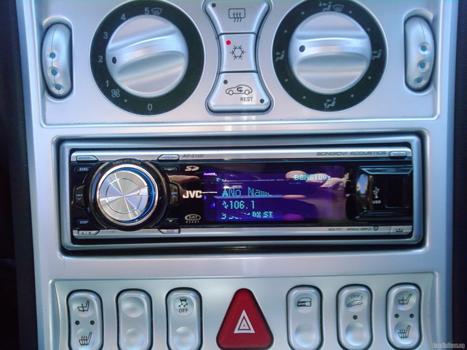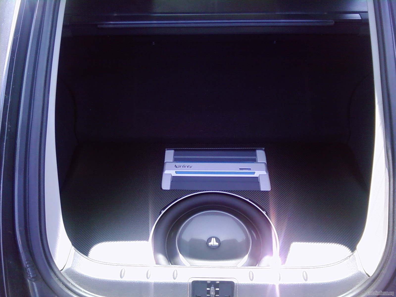 Hey!!! Just got back from BLKFIN's (Scott's)!!! We (well actually just him lol) put together a new subwoofer system as well as a new KDS 1000 JVC headunit!!! For the sub, we used a JL 13.5 Shallow mount subwoofer and for the amp a Infinity Reference 1600a. It was mounted in a box made by Scott and the cover was made also by Scott with a Carbon Fiber looking wrap! He did an AWESOME job!! and this thing really pounds!
