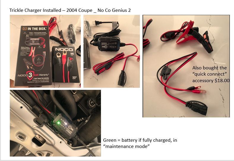 After 3 weeks of sitting in the garage under car the cover, my '04 XF turned over slowly but still started! I guess the cold weather may cause the battery to drain more than in summer. After researching several trickle charge brands, went with NoCo (NOCO - Genius) and it was on sale. Purchased the quick release accessory too - making it easy to connect. Top quality and easy installation. If your XF sits undriven like mine, under $50 to keep your battery healthy & always charged. Hope you find this useful,