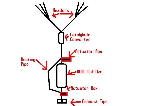 I know there are a few "exotic" car that have like a dual exhaust system set up where you can change the sound of the exhaust by hitting a button and it actives plates that reroute the exhaust. I was wondering what exactly it would take to do this. I posted a basic illustration to show you what I mean. I think it would be cool to have the OEM exhaust system but having a tube route around the muffler theremore making it like a straight pipe, and then having the option of the two... Any Ideas on how to go about this?