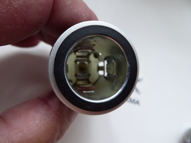 One side of the positive pole can be seen on the left-hand side of the socket in the photo, it looks like a clip, it sits in a cut-out in the silver tube. The silver tube which looks white in the picture is the negative (ground) pole, it has two clips on it as well and one can be seen in a cutout just above the black plastic at the front.