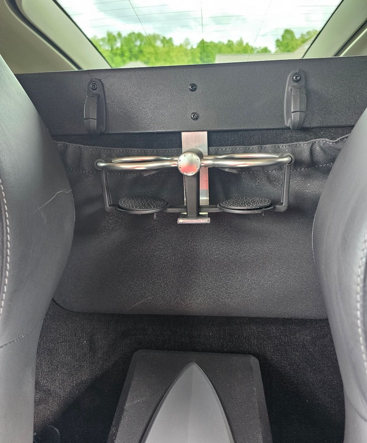 I found the Audi drink holder on eBay. You have to be careful to make sure all the parts are there. I made the bracket out of flat 1" aluminum. It is attached underneath by a screw that I feed through the black center piece. Then I carefully drilled the holes for the two screws that hold it to the bulkhead. You have to be careful, as the gas tank is behind that bulkhead. It works well and holds a water bottle with ease.