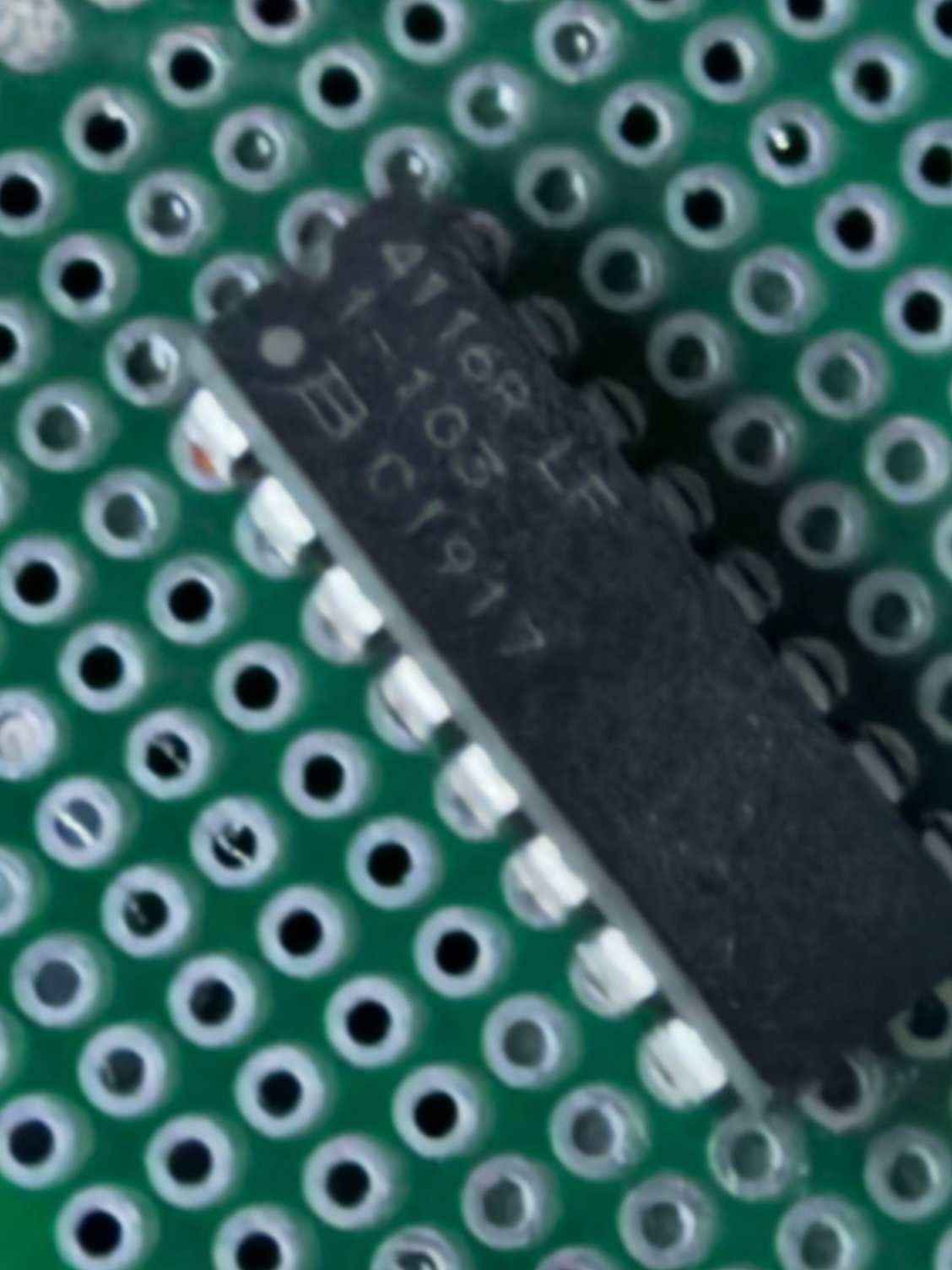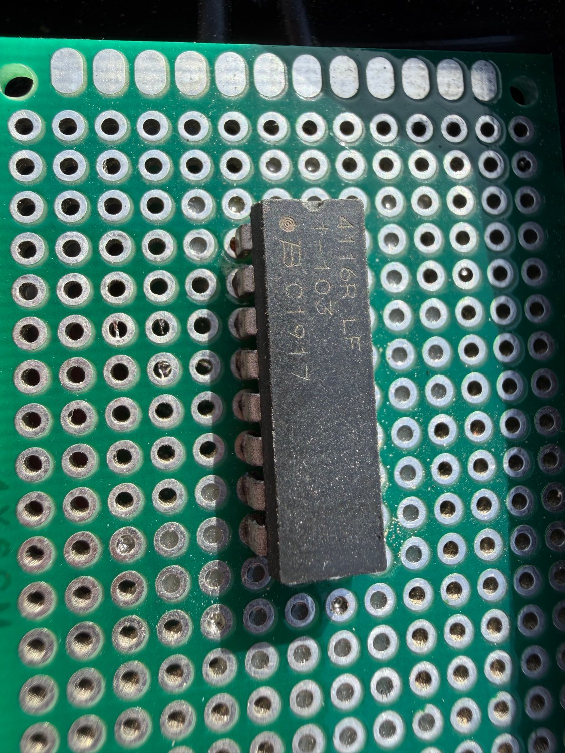 This is a universal prototype printed circuit board (PCB) with a surface-mounted component, likely a CPU or MPU, attached to it. These boards are typically used for hobbyist or prototyping projects.