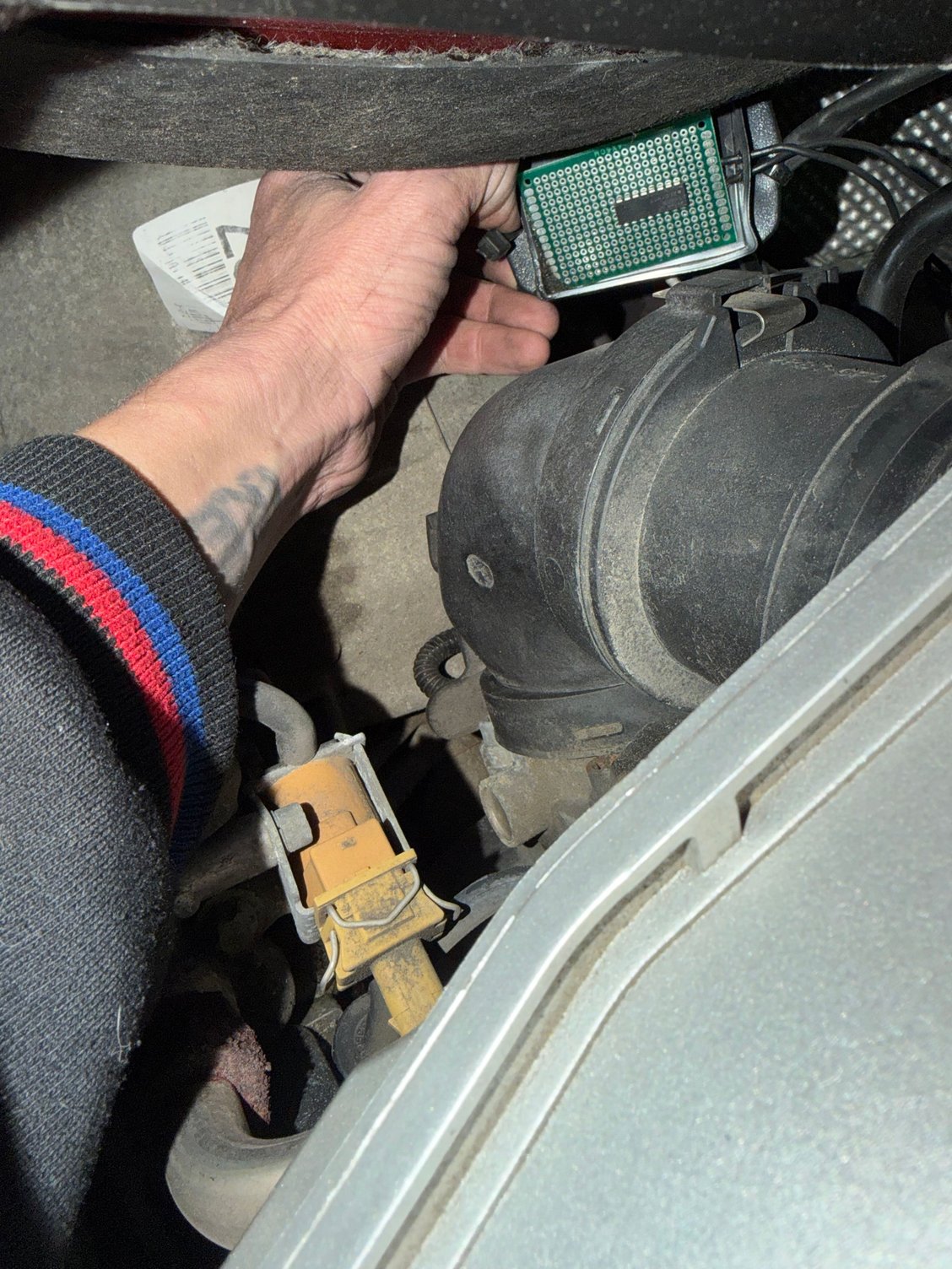 The board is installed in an automotive application, likely as part of a custom electronic modification.
