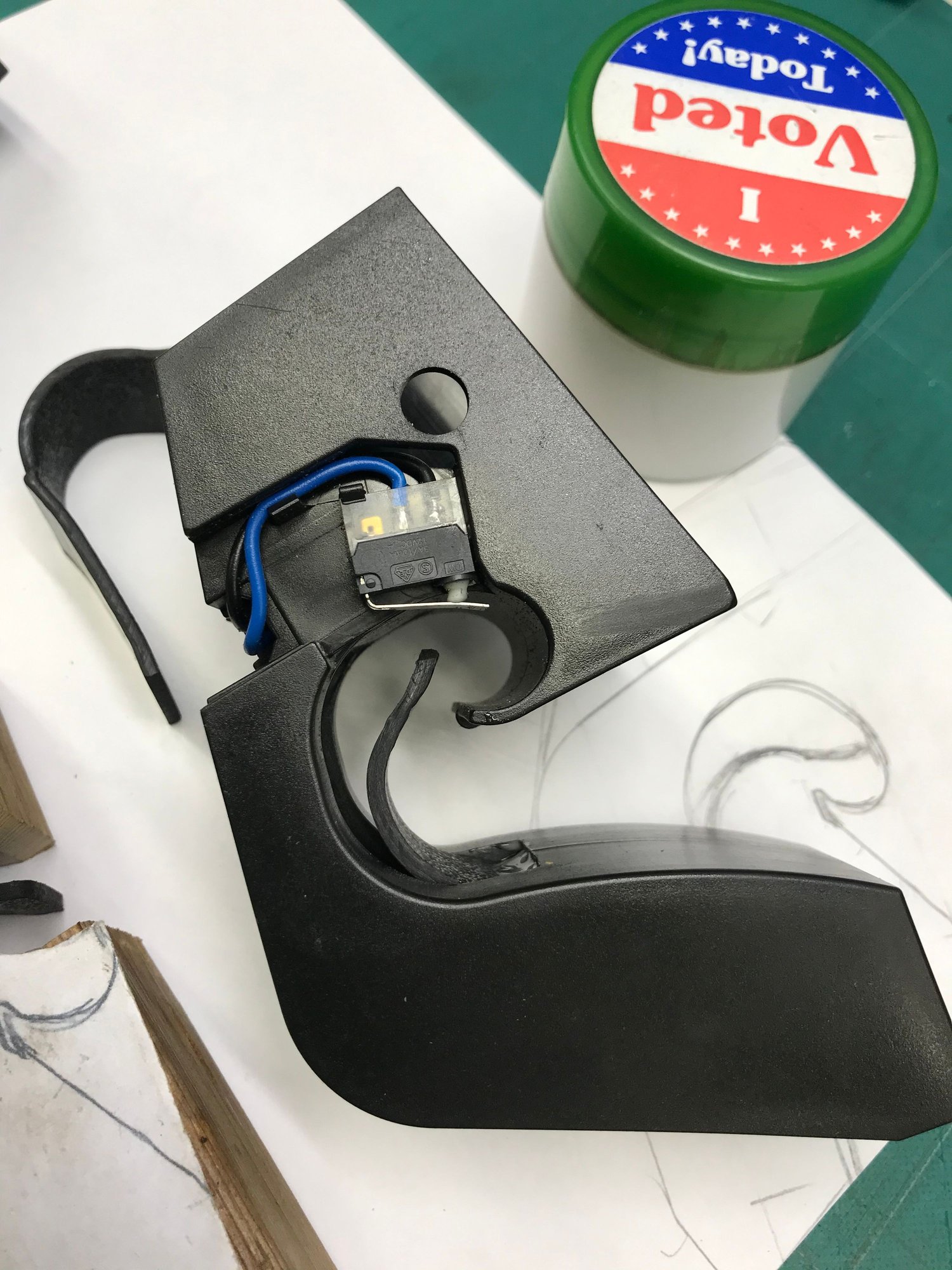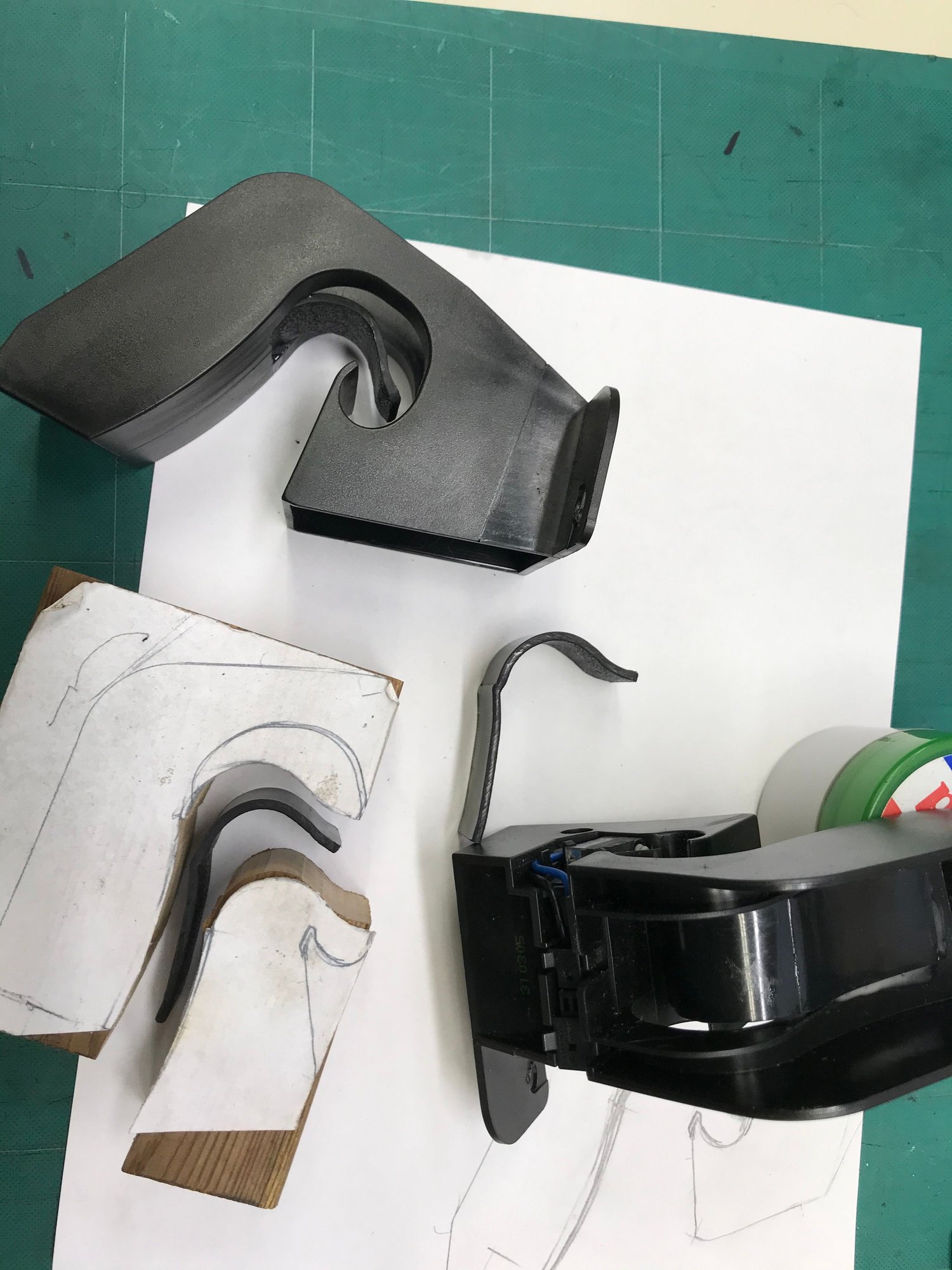 The other day (ten years later) after considering a couple of potentially unsuccessful solutions I came up with a fix that should work, costs pennies, and should hold up over time. The photo below show that I cut a piece of 3/16 inch ABS plastic sheet in 7/8th"wide X 3 1/2" long strips. I used a 2"X4" piece of scrap wood and cut the profile of the bracket that I had traced on a piece of paper. I then heated the ABS strip to the point of being extremely flexible (like a well done wet noddle) and then clamped it in my homemade jig until it cooled.