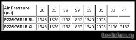 The above chart correctly shows that an extra load tire is not rated to carry any more load than a standard load tire when both are inflated to the same pressure (up to the standard load tire's "maximum load" pressure of 35 psi). This is because a tire's load capacity is a function of its size (which determines the size of the "air chamber"), its construction (which determines how much pressure can be held) and the actual air pressure used (which determines how many air molecules are forced inside the chamber). All tires with equivalent physical dimensions carry equivalent loads (until they reach their maximum load pressure).