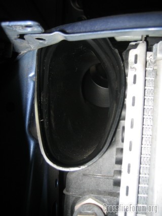 Now the air boxes are firmly secured in place and attached to the Y-pipe. I removed the stock SRT plastic radiator intake fittings (both sides) and fit the right side intake tube through the opening (See Pic) perfect fit – no trimming required and slid the other end into the airbox. Done Deal.