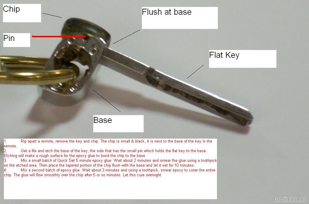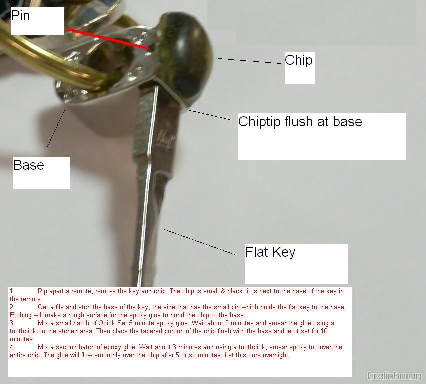 - Rip apart a remote, remove the key and chip. The chip is small & black, it is next to the base of the key in the remote.