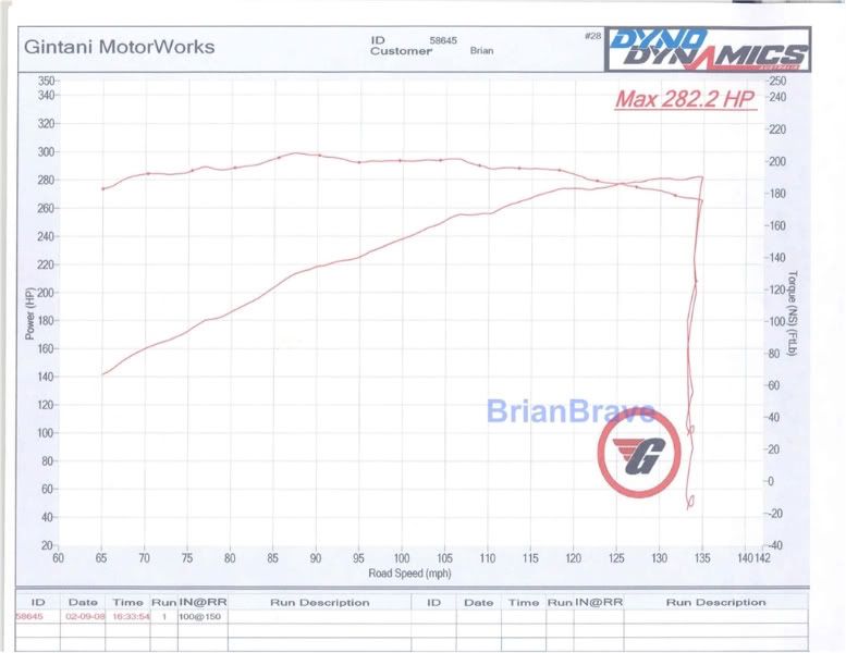 Here is dyno pull #1 on a DynoDynamics @ Gintani/Speed Innovations after I had installed the SL55 intake, 185mm Pulley and Iridium Plugs prior to the tune. The AFR was 10.5 – 11.0. This graph was poorly setup because the Power and Torque references differ on each side and the bottom should be displaying engine RPM – This was my fault - You need to make sure you ask the operator to set up your charts correctly - you may want to a printout that is different then what they need to see.
