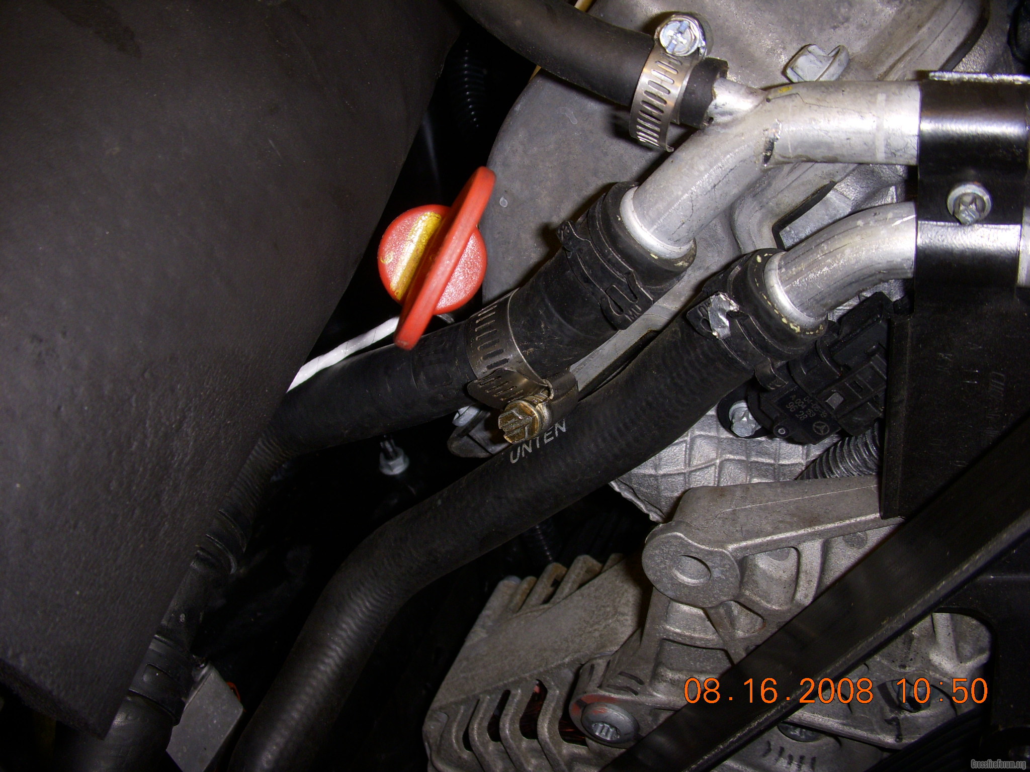 Photo showing a hose clamp that marks the outlet hose FROM the intercooler to the H/E.