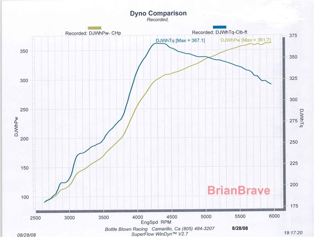 You guys are all far more experienced in these cars than me, but these are my numbers on a mustang dyno, on average 12% less than Dynojet. 350hp and 342lbs of torque at 5800rpm. 12.2 AFRs. Only mods are the single NW cold air intake and a 62mm EC supercharger pulley. No tune and crappy plugs I changed out today. Dyno results do matter and I haven't seen any support even a moderate increase in either hp or torque on this forum. But I defer to your experience with the DCAI. I'm good with the single. Thanks for the reply Doc!