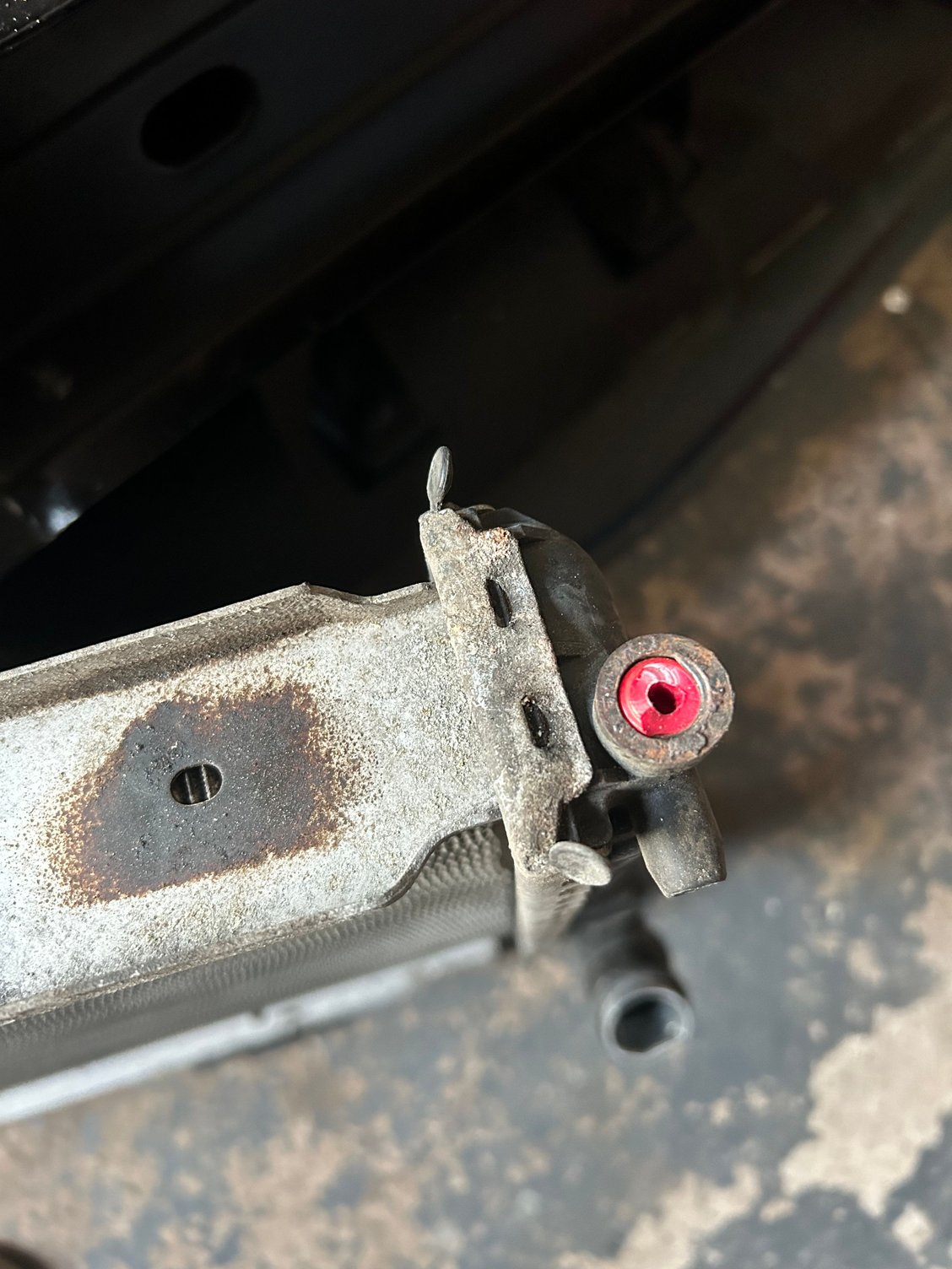 Any guidance or photos appreciated! Radiator upside down red plastic piece in bottom insert Broken Transmission lines Broken transmission lines Label on one line one leads to this Rod bolt which will lineup, but at an angle