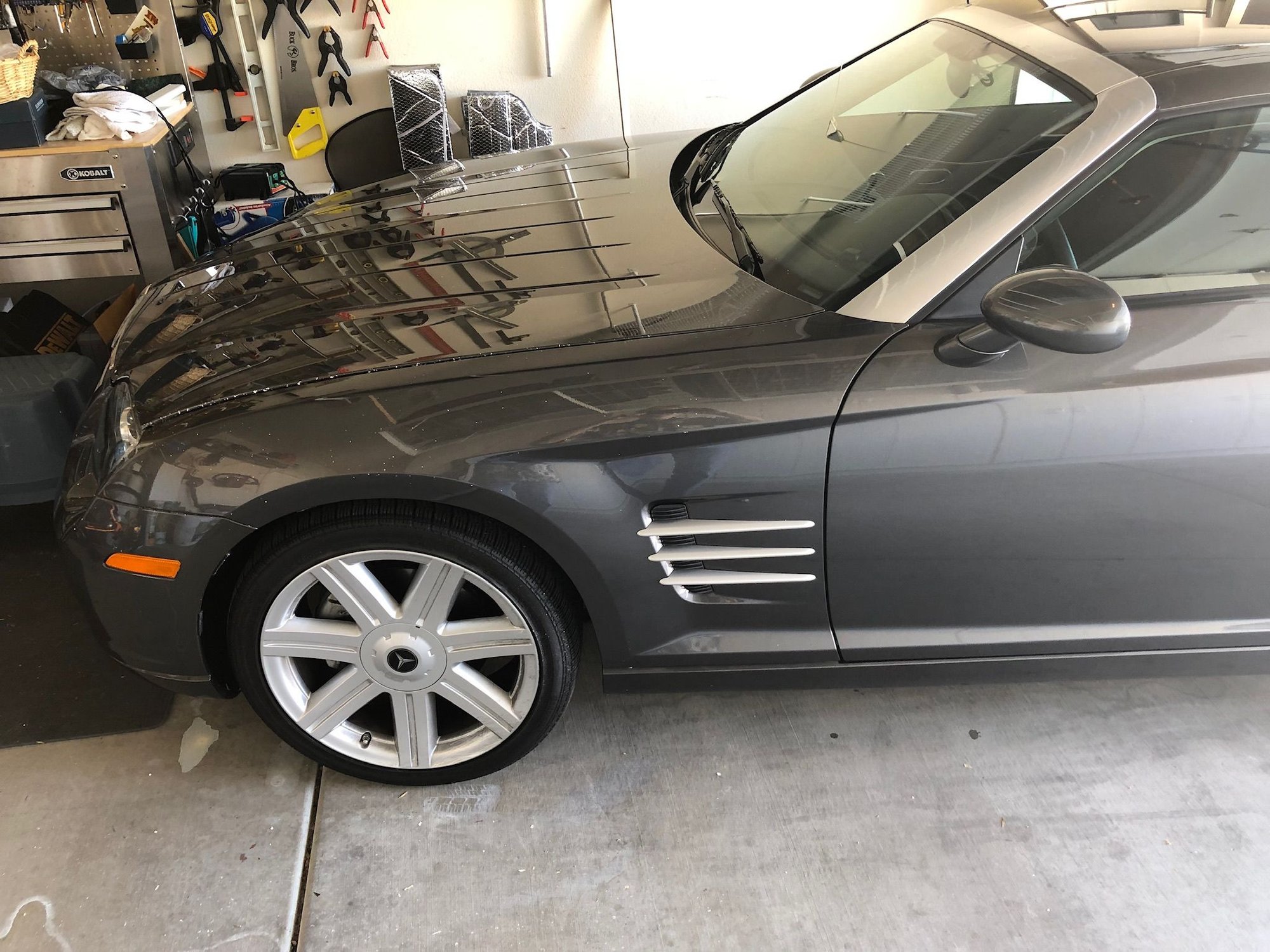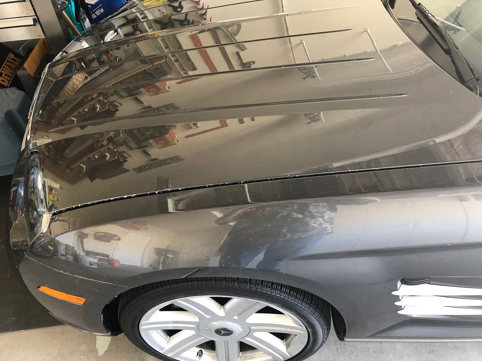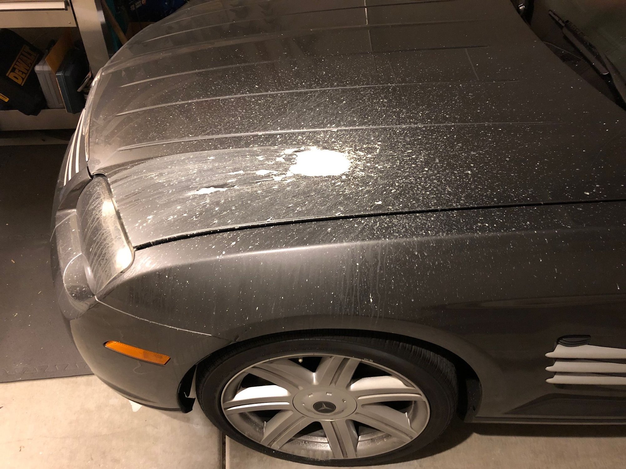 I’m not sure if this is the correct forum. My neighbor called from our other home in Henderson, NV and said that I had a broken sprinkler in my yard and water was shooting up. I called our Gardner to take a look at it and my neighbor went over to open the garage door for him. She called me back and said there was a water leak by my water heater. Ok, it’s just getting better, so I call the Plummer to take a look at the water heater. He calls me and tells me what needs to be done. He then asks me if I know about my Crossfire and I ask “what do you mean”? He tells me a five gallon plastic container of latex paint stored on an overhead shelf cracked, and the latex paint dripped down onto my car. I was so stunned and sick I didn’t think to ask him to take a picture for me. He’ll be back Tuesday so I’ll get one. I’m flying down next Saturday so I’ll be seeing it in person.