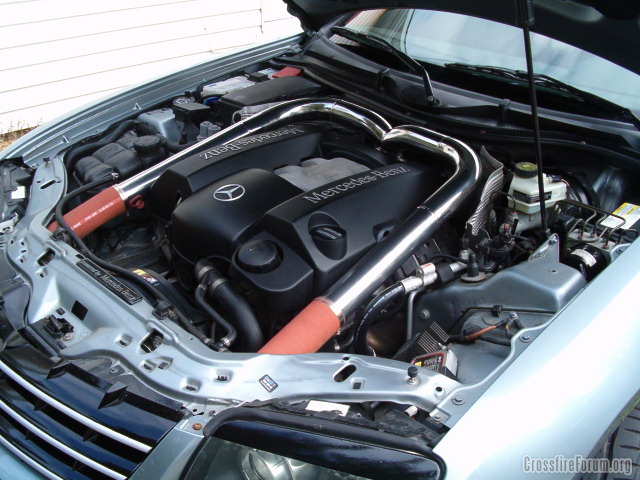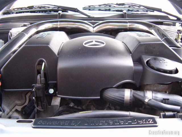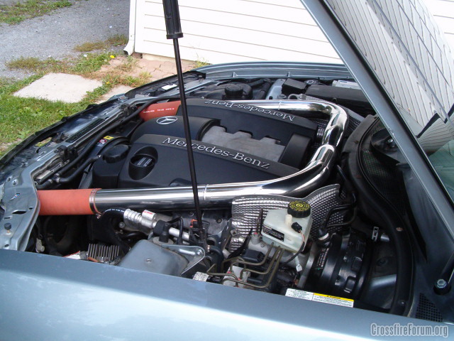 I already posted this at CICCI so I thought I would post it here also. I just finished polishing a Dual CAI that a friend and I made for my NA crossfire. It is made from stainless steel. The 2 side pipes are 2 1/2" and they go into a 3" and then into the throttlebody. It produces a nice sound and improved gas mileage. The air filters are located behind the grill, the horns have been relocated behind the bumper to allow room for the filters. I purchased the Mercedes engine cover from the Mercedes dealer and it fits with minor trimming to allow for the rad hose which you can see in the pictures. I will be getting the top if the intake plenum (center of the engine cover) polished over the winter time just to finish off the polished look. Thanks for looking.