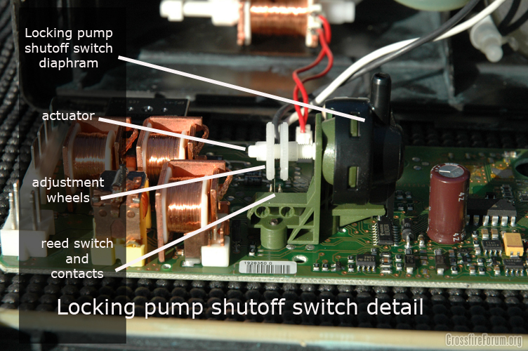 The pump motor would not shut off properly and I found the contacts to be dirty. They are a bit hard to see behind the green plastic bracket.