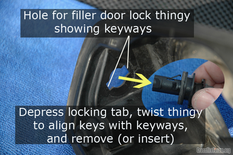 The filler assembly is held in place by 4 tabs. I wish I had a picture for you, but I don't. The tabs are accessed from inside the fender area (naturally), and you will have to find them by feel. There are two on top and two on bottom, and you can depress them with a hard edge like the blade of a flat screw driver. They are a real pain to get to. Also, get a helper on the outside to pull on the assembly as you work your way around the tabs so they do not snap back into place before you get all four done. The door hinge extends behind the fender and makes the removal more difficult. Protect the fender with something or you will scuff the paint as the filler door grinds against it. I used a large refrigerator magnet, but you could use a few layers of tape, too.