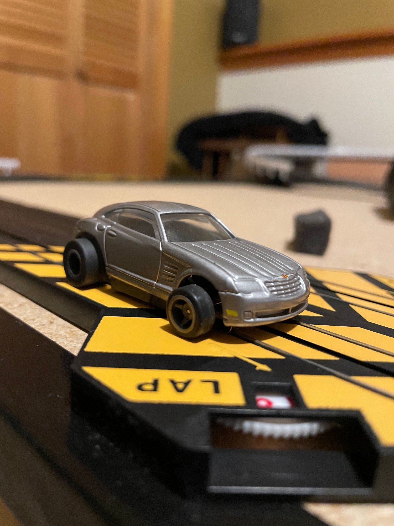 I set up an old HO race track during this time of year (holidays) for my grandson and I to play with. This year I modified a Life Like slot car chassis to a 1/64th scale die cast Crossfire, my grandson gets a kick out of driving "papa's" car around the track.