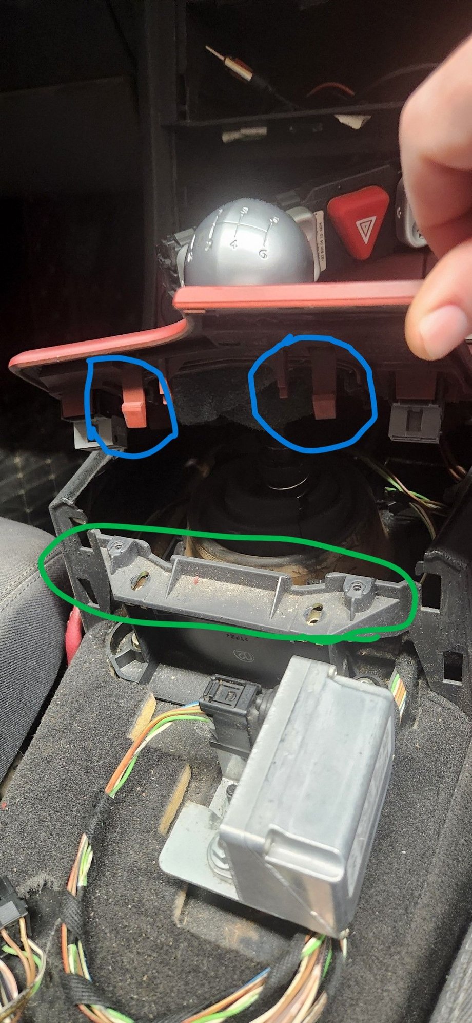 Does anyone have a parts diagram or pictures of the what the shift cover on a manual snaps into to retain the back part of the cover plate in the center console? I think I am missing a piece as the cover plate pops up from the back upon shifting. Where do the tabs circled in blue snap into?