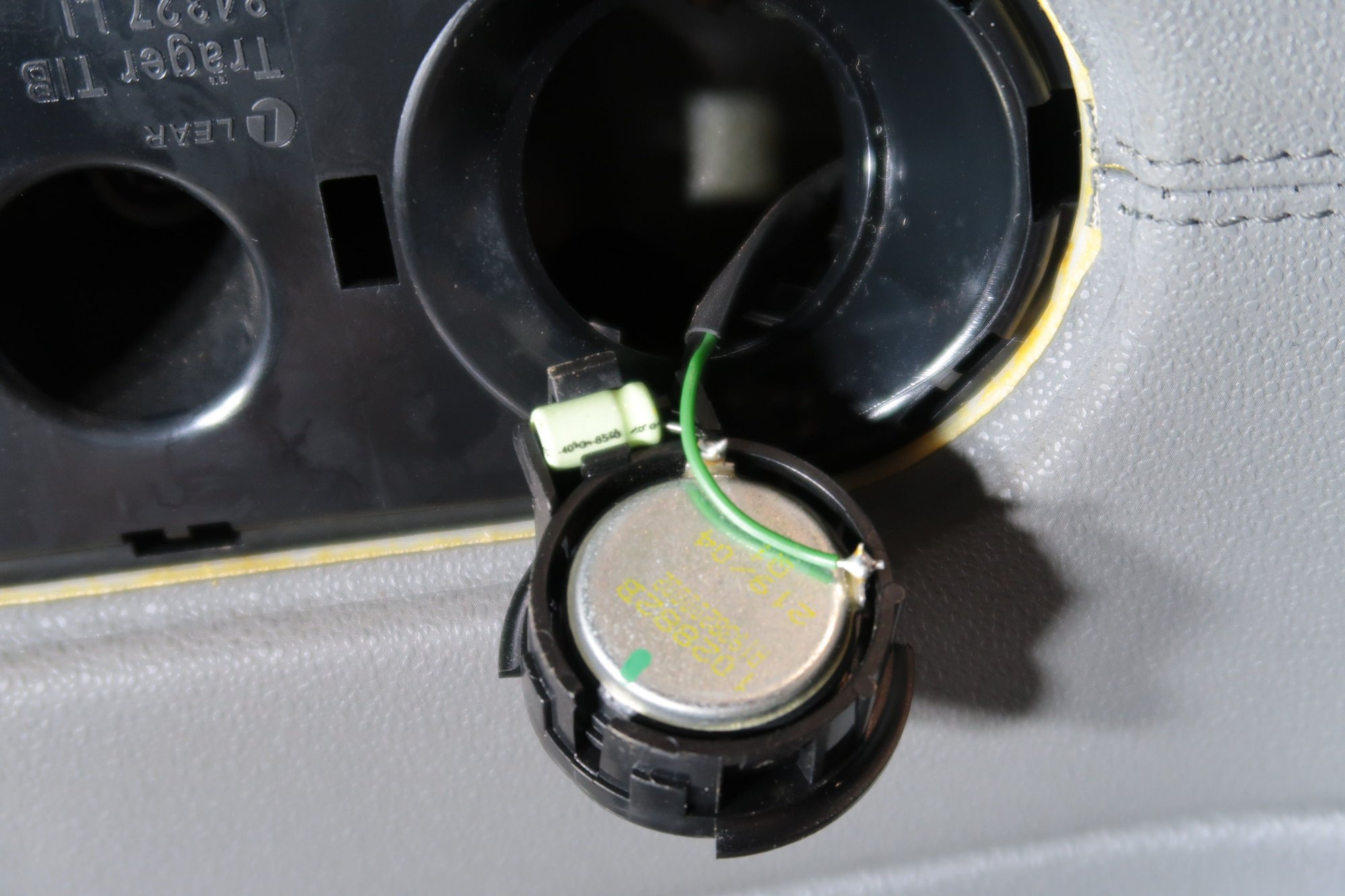 Now use a soldering gun and take just the tweeter off, keeping the capacitor. Be carefully not to touch with the soldering gun the inside door panel!