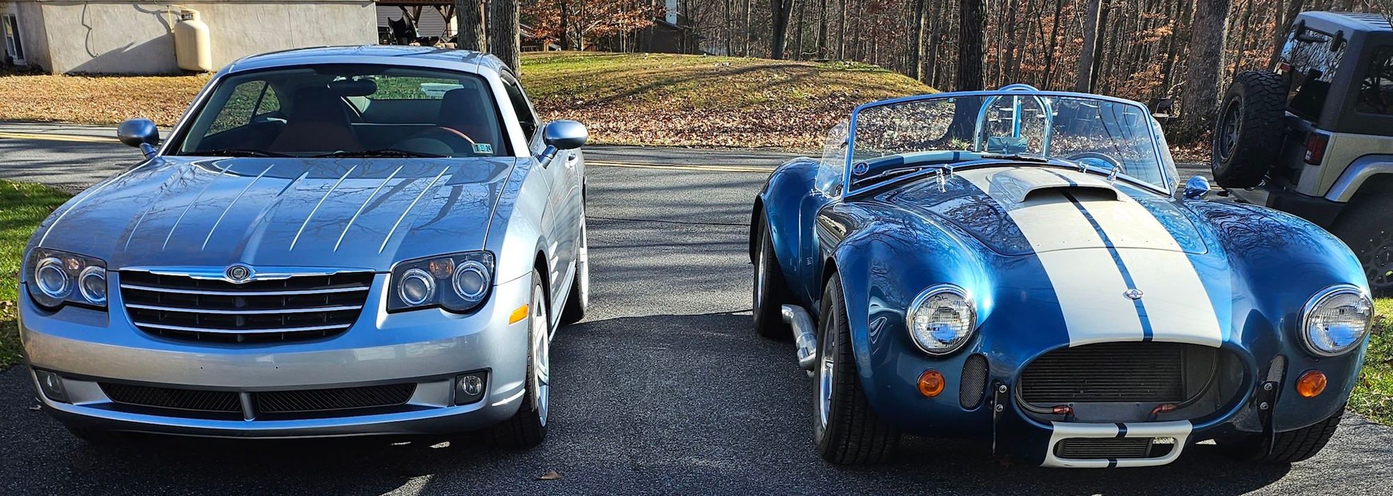 Hello and happy holidays to all! I'm in NE Pa and have been a "gearhead" all my life LOL, drag racer from the 60-70's, drag race and road race motorcycles 70-80's and still love'em all! Years ago attained my dream car, a replica ERA 427SC Cobra and enjoyed every second! Sadly at This point I can't physically drive/enjoy it any longer due to health issues, 2 weeks ago I watched it go down the road to live in Florida with my son. I always liked the Crossfire, think they're really nice looking cars and went to look at one, it was showroom condition, 31000 miles, perfectly stock, silver blue metallic w/gray/cedar interior and auto trans (this was necessary but will take getting used to LOL!), bought it on the spot and home it came, just before the Cobra left. I've only driven it twice since I got it Nov 3rd and am definitely going to have to adjust but I think it's going to be an enjoyable ride! I had already joined the forum to gather info on the cars before I bought mine and would like to thank everyone here, there's a wealth of knowledge on the cars here and it's availability is one of the reasons I decided to try a Crossfire, a lot of info, gathered from a ton of hard work, time, dedication by the contributors and kindly shared to all, so again, thank you for your work and willingness to share, greatly appreciated. I wish I would have been a bit more patient though, after I got my coupe I started thinking I'd like a roadster (actually a convertible, to me a roadster is open top, no roof, no windows LOL!), and didn't know the difference between the models, ie: SRT6, sorry, was stuck in the 60's. So, at this point I'm the proud owner of a mint 2008 crossfire coupe but am considering another, a roadster, and preferably an SRT6, and they'll both fit in the garage! Please excuse the pic quality, from a phone and the Crossfire had actually sat outside overnight, and off course, it rained! so it's actually filthy in the pics, they were taken after playing "musical cars" and I got it in the garage but before I cleaned it up! The pics of the XF and the Cobra are just nostalgia, I'm still going thru "withdrawals" LOL!