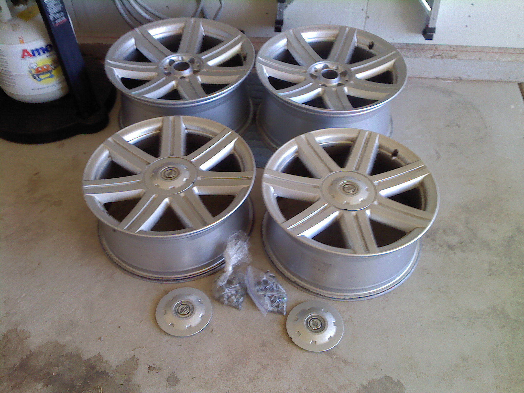 I have a set of 4 OEM wheels for sale (Non-SRT6). They have less than 15,000 miles on them. Two 18"s and two 19"s. One of the 18"s has a tiny spec of "rash" (pictured) and one 19" has some curb rash 70% around the wheel (two close-up pics attached) but silver touch-up paint would do a lot to cover it. The wheels are otherwise very good. Included are all the lug bolts, and center caps ($100+ value on ebay). I live in Wichita Kansas. I'm asking $475 plus $100 shipping, obo. Feel free to text 316-213-3005. Thanks!