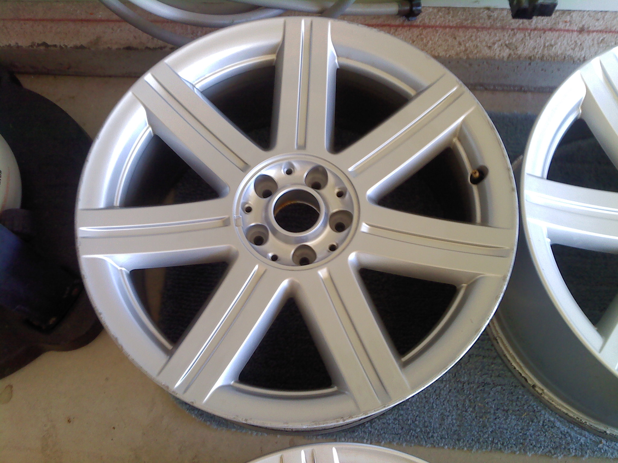 I have a set of 4 OEM wheels for sale (Non-SRT6). They have less than 15,000 miles on them. Two 18"s and two 19"s. One of the 18"s has a tiny spec of "rash" (pictured) and one 19" has some curb rash 70% around the wheel (two close-up pics attached) but silver touch-up paint would do a lot to cover it. The wheels are otherwise very good. Included are all the lug bolts, and center caps ($100+ value on ebay). I live in Wichita Kansas. I'm asking $475 plus shipping, obo. Feel free to text 316-213-3005. Thanks!