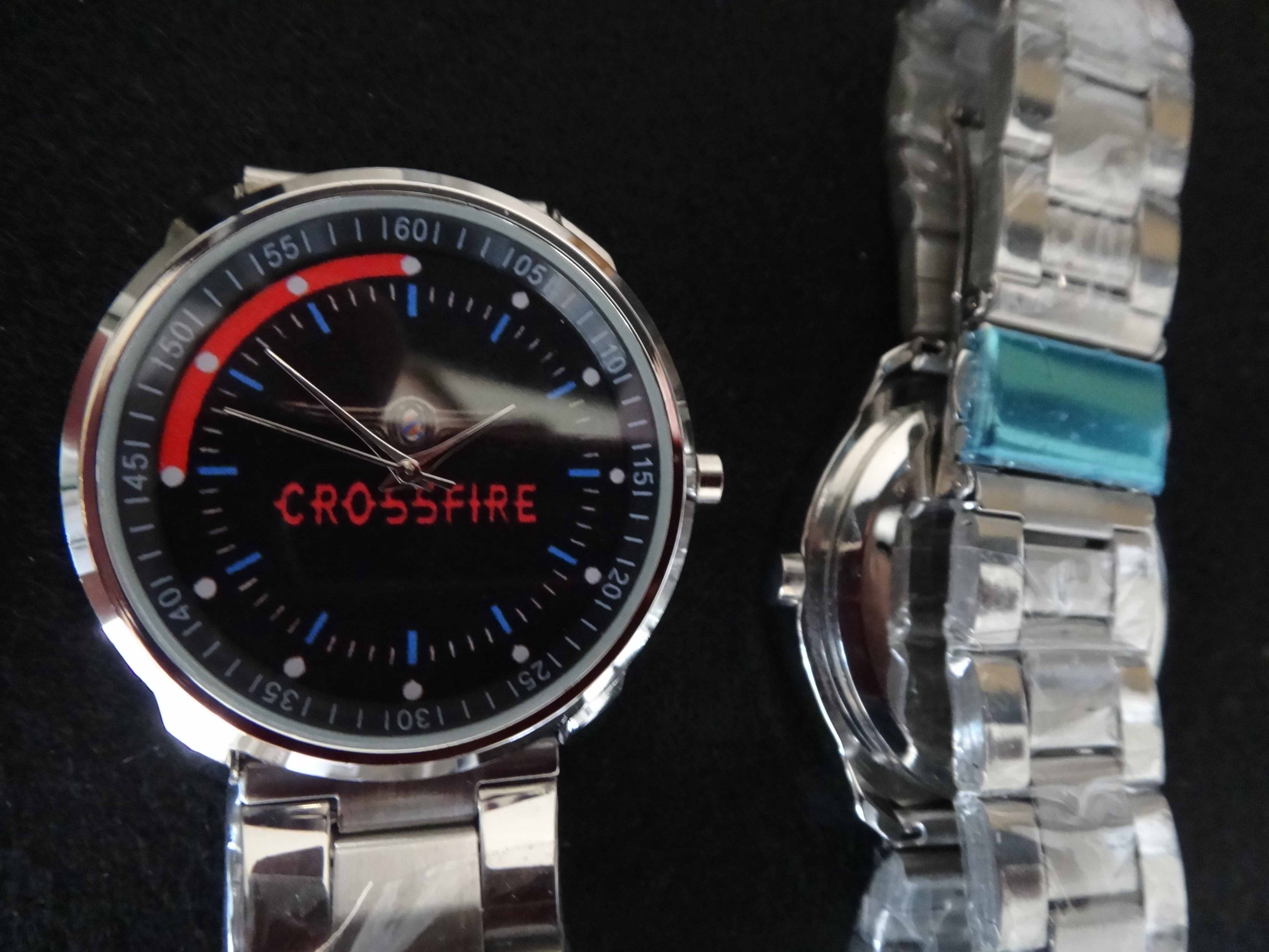 Watch:CROSSFIRE" in red across black face w/ blue tick marks, battery operated, second hand. NEW, never worn, in plastic! Silver metal adjustable band. A must have accessory. Check out the pix. Bought a 2nd watch for wife