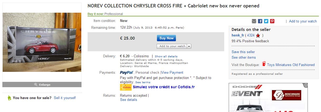 eBay | NOREV COLLECTION CHRYSLER CROSS FIRE Cabriolet neuf + boite jamais ouverte