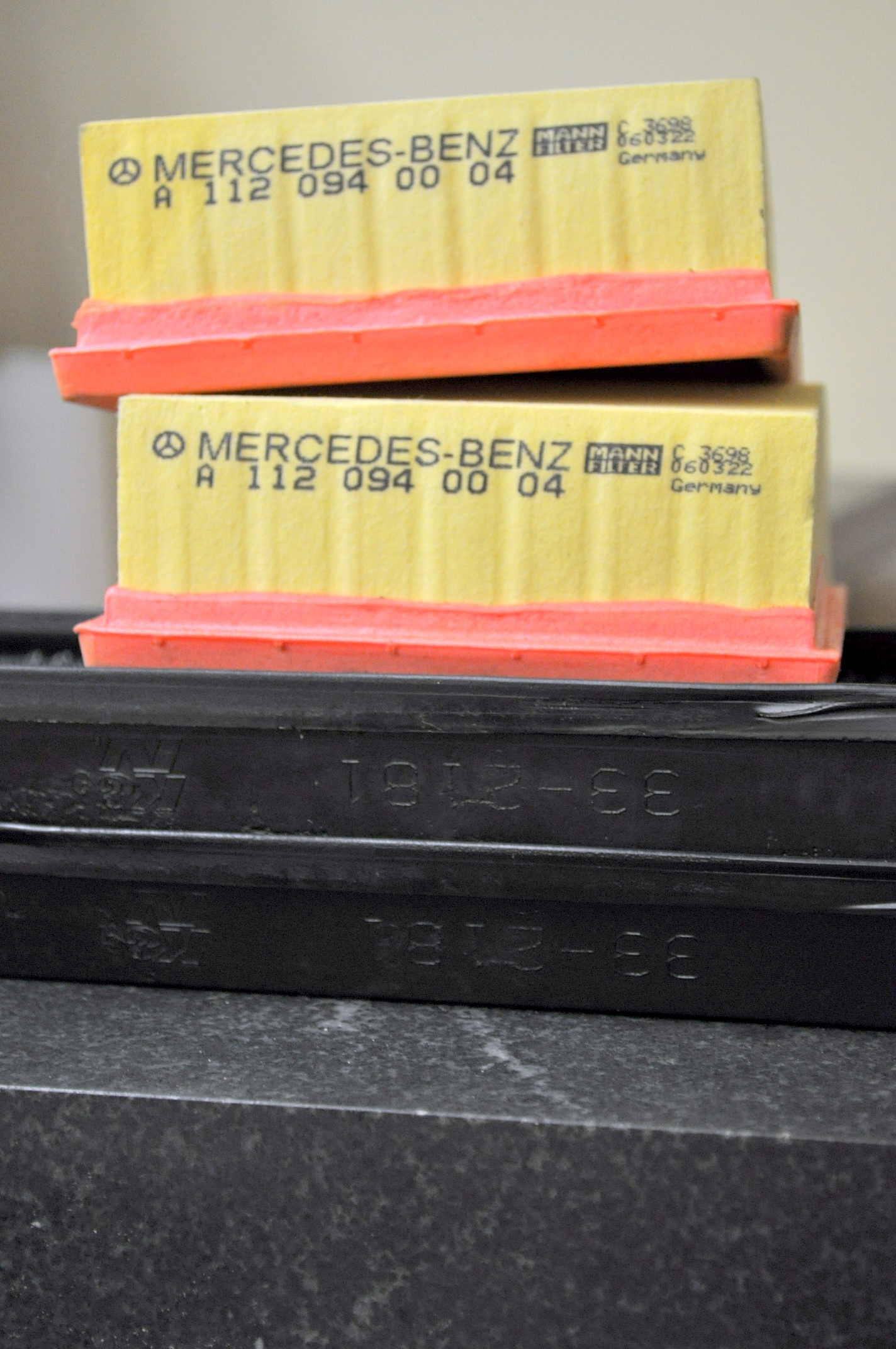 Air filters for the NA Mercedes Engine Cover Modification, two of the OEM (paper) part number A 112 094 00 04 and two of the K&N filter 33-2181.