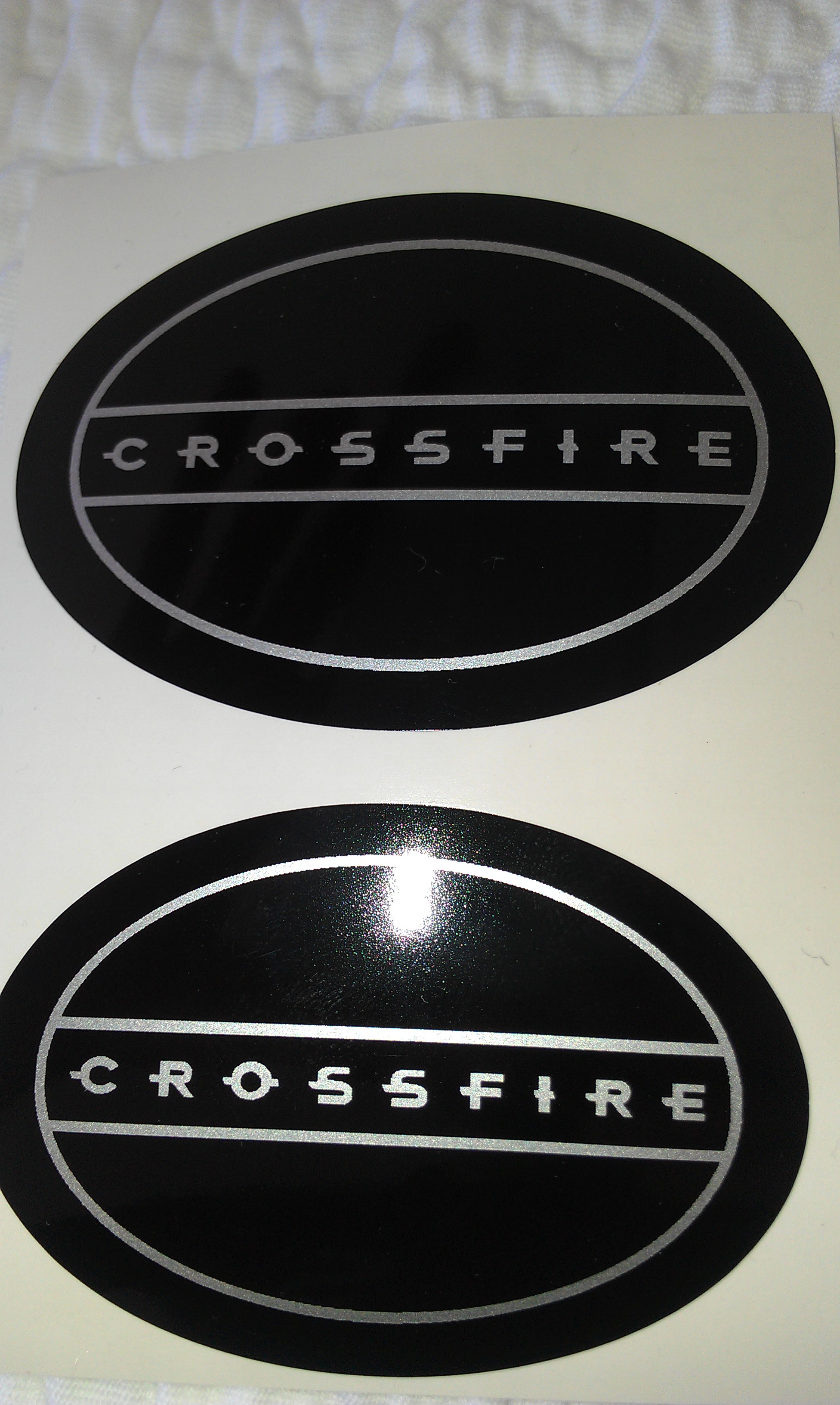 the design is black background and silver writing "CROSSFIRE" (see attached pics)