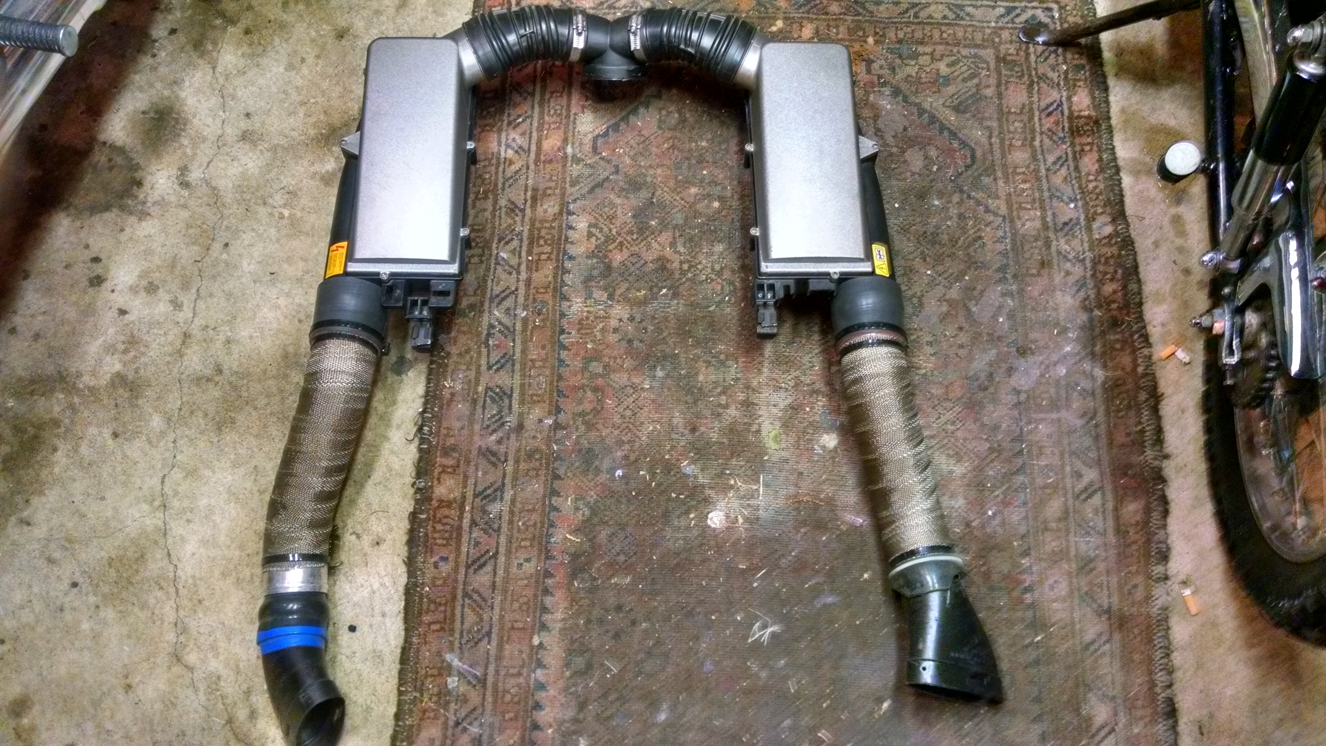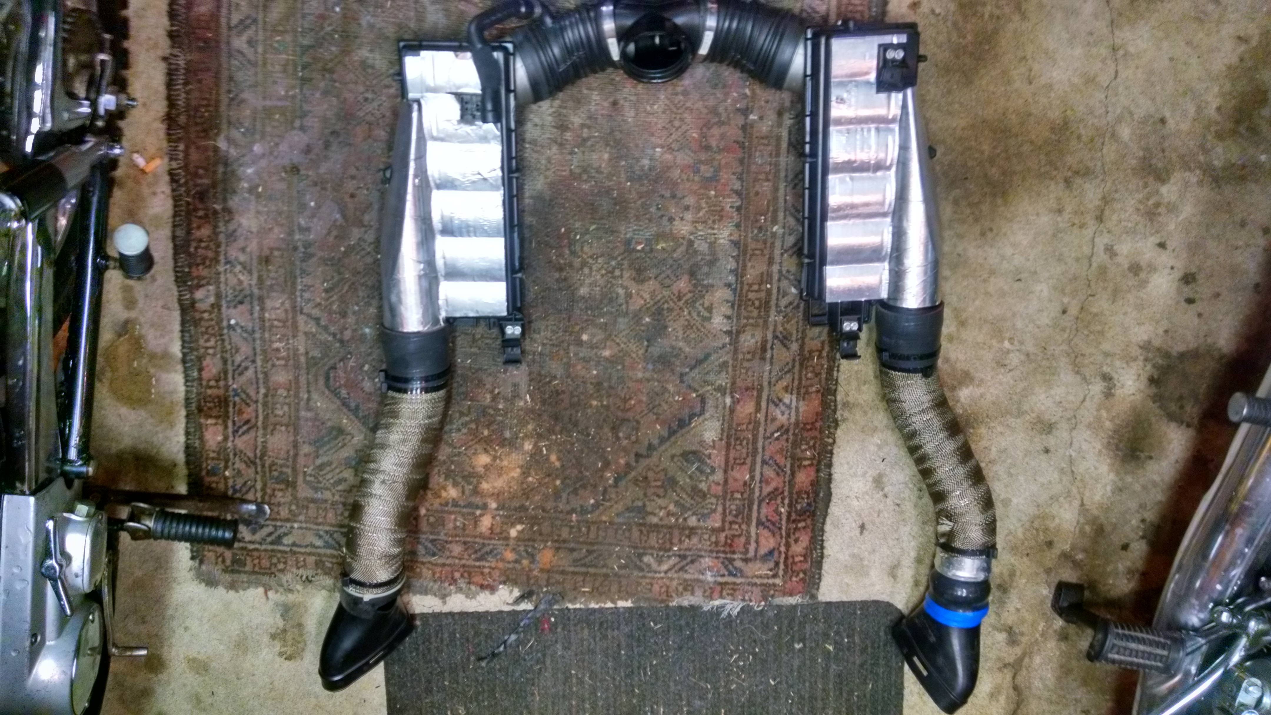 I have a complete SL55 intake for sale. Look close at these pictures. Engine cover is not included. Brackets are included for an easy installation. K&N filters are inside they are cleaned and oiled. Dei heat shield on bottoms of boxes. Includes TVT python tubes wrapped in DEI header fabric. I am showing you pictures of how I mounted the AMG scoops. Also how I modded my plenums for a better fit. You will have to be creative on how to get through the radiator support. The boxes have some very small scratches so they are not perfect but look great. There is one tab missing on the Y-pipe to throttle body but it is a snug fit and stays put. I'm asking $350 plus shipping. Paypal only! Feel free to ask any questions, Tuna.