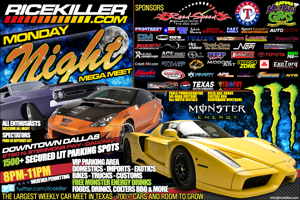 If you guys haven't heard about it yet, there is this one site called ricekiller.com. It's a site where car enthusiasts can meet and talk about, obviously, cars. The name "rice killer" doesn't exactly mean domestics beating up imports, but more like both domestic and import, even exotic car owners who are against the "other" people who have no respect for their car and beat it to death. Anyway, they have this car meet every 1st monday of the month with all sorts of car enthusiasts showing up in their Corvettes, Vipers, Mustangs, GTR's, Chevelles, Civics, Lancer Evos, Integras, 180SXs, and a huge assortment of other cars. For now, my Crossfire, is the only one that shows up and I'm trying to see if I can get some more Crossfire owners out there to show up as well. It's held in Dallas, at 2720 N Stemmons Fwy in front of the Stemmons Towers every 1st monday of the month. If I can get some more Crossfires out there, we could even get our own parking spot near the VIP Area. Monster Energy Drink is usually out there at every event as well as Reed Speed. If anyone is interested, PM me and I'll give you further details.