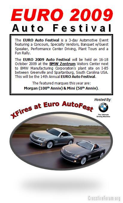 The 2009 Euro Auto Festival is being held on October 16-18, 2009 at the BMW Manufacturing site in Upstate SC. You really don't want to miss out on this event. It is limited to European origin marques and the Crossfire, assembled at Karmann plant, qualifies! I've attended several years with my Merkur XR4Ti's (also assembled at Karmann plant) and this show is really turning into a fun-filled weekend. Mark your calendars.