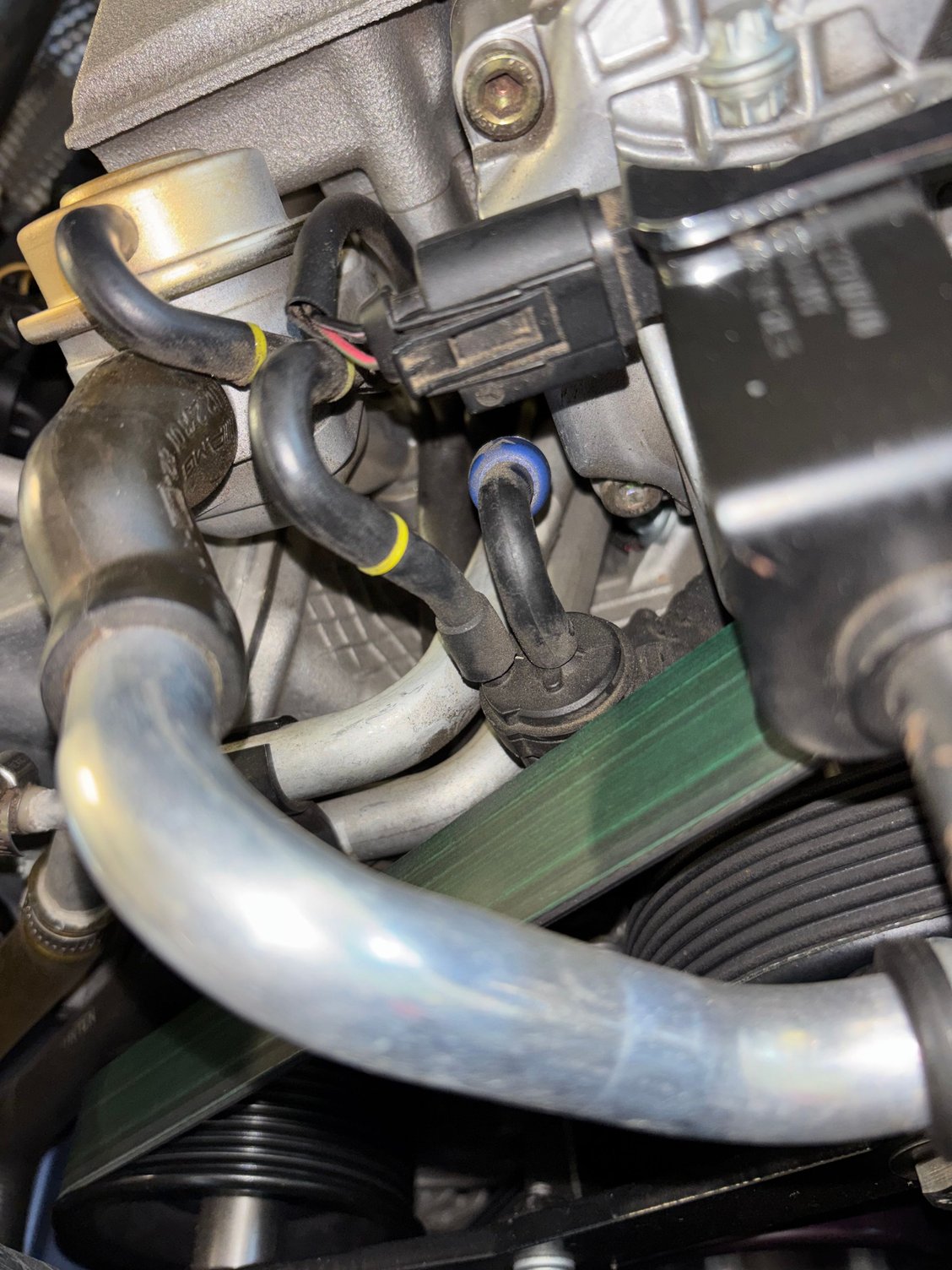 The vacuum is fed to the solenoid valve blue inlet from the rear of the car through a clear vacuum line that runs to the rear of the car under the passenger fuel rail. The solenoid valve is controlled by the PTCM. There is another clear vacuum line that runs under the supercharger between the two switch over valves (The two gold colored large valves that the large hose and metal tubing connect to the air pump). It is easy to tell if the solenoid valve has vacuum and feeding the vacuum to the switch over valves at startup. Simply pull the vacuum line off the switch over valve and put your thumb over the end of the hose. In your situation I would pull the line off the driver's side switch over valve first. You can feel the vacuum when you remove your thumb from the hose. That vacuum should only be there when the air pump is running at the cold start up. So that will test the vacuum lines and the solenoid operation, but it doesn't tell you if the switch over valves are opening to allow the air pumps pressure into the exhaust system. That's what monitoring the O2 sensors can tell you, but as I said that's difficult to determine by just observing the O2 sensors output voltage.