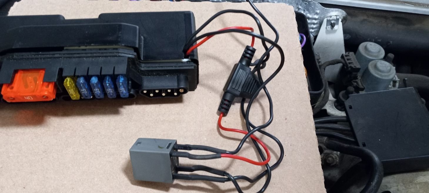 Two black and one red wire coming out of module. Has a fusible link and a relay