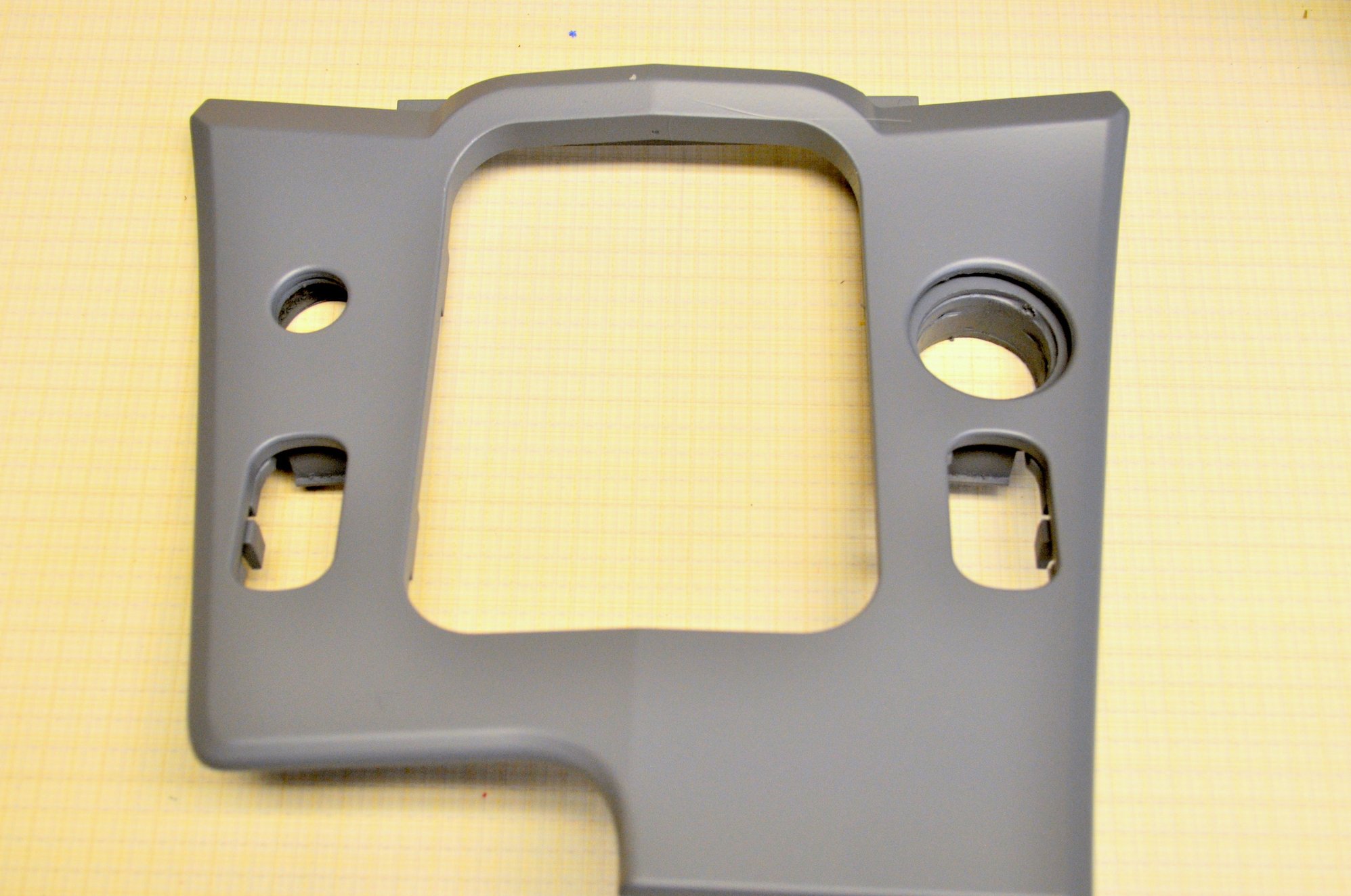 This is a trial fit of the bezel in the console. There will be a charging outlet or lighter socket on the right -hand side of the gear shift bezel, the light for the passenger airbag will be on the left-hand side.