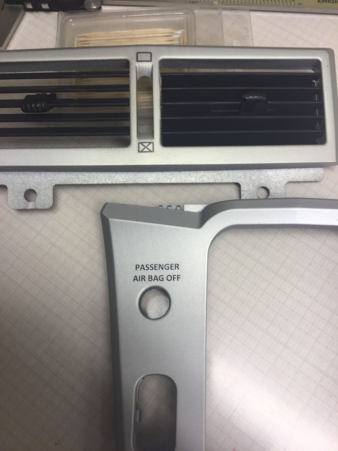 The gear shift bezel modified to locate the passenger airbag light and the lighter. The skirt that fits against the gear shift bezel has been fitted.