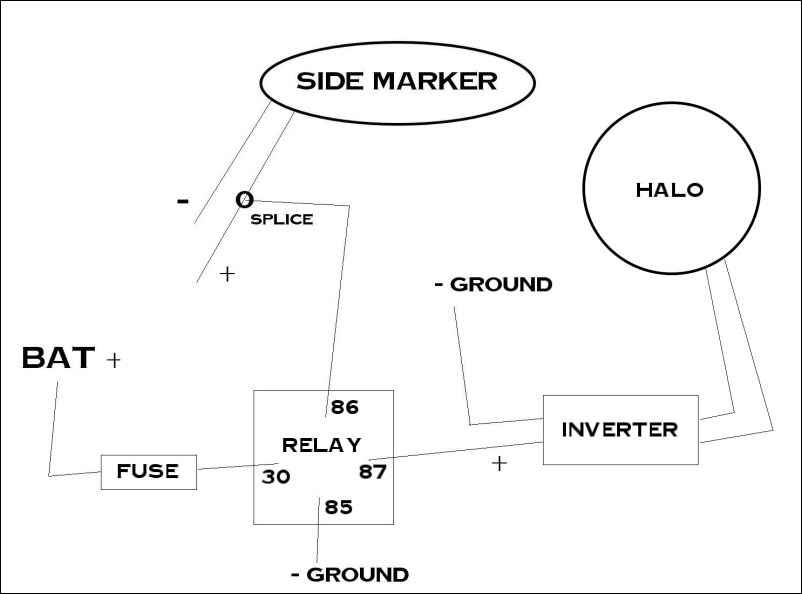 thank you for the very helpful diagram. I have 4 rings with 4 inverters. I want them on whenever side markers are on like in your diagram, so i need 4 relays???and what amp relays? Would these mount into a relay block??? i wouldn't want to splice into each sidemaker in 2 places and have wires running all over the place. thanks for any help,