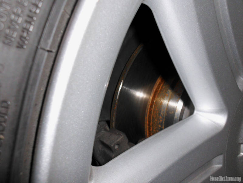 I finally got around to taking pictures of the Crossfire since we just bought a new 14 megapixel digital camera. I've been telling you guys/gals about how my wheels make a rhythmic metal on metal sound and squeak/squeal when braking (and now when going in reverse). Well, here's why: