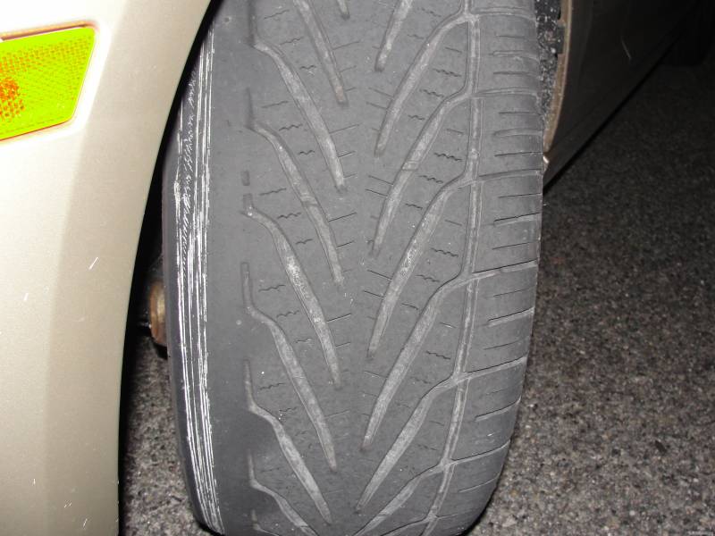 I just checked my tires all around and they look fine. downwardspiral, your issue there is not just from rubbing on a bolt - those tires are experiencing very uneven wear due to some sort of an alignment issue. Get some new tires mounted and then get to a good alignment shop and maybe even bring them a print out of that picture.