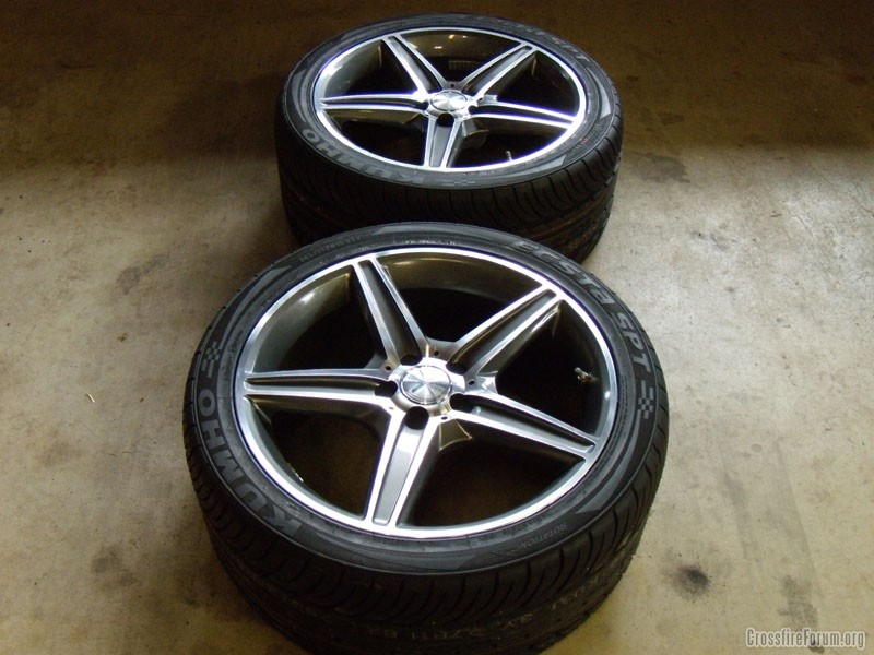 I got some MB copies through Rob last week for the Aero.... they are the AMG style 810. Front is 18x8.5 with the Kumho Ecsta 235/40's and rears are 19x9.5 with 285/35's... here are pics of the rears..(the lug bolts were too long and need to be trimmed)...