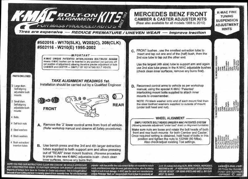 Just ordered the front Camber kit from K-mac ,a little pricy but I want my car in spec and this is a sure way to to get it there being lowered ....I'll try to post some pics after I get them installed....anyone else on the forum installed these on the front of their car ,,please chime in with some info ...